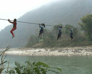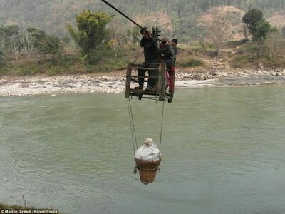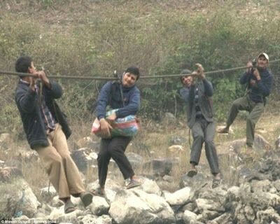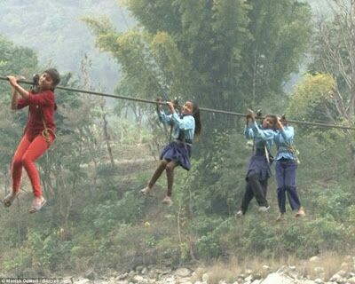 Children in Dhaing Village, Nepal have no choice but to pull themselves across this terrifying cable bridge every day in order to get themselves to and from class. The hazardous river crossing is a lifeline for the residents, who have no choice but to face danger every day in order to go shopping or meet friends and family who live the other side of the Trishuli River.
